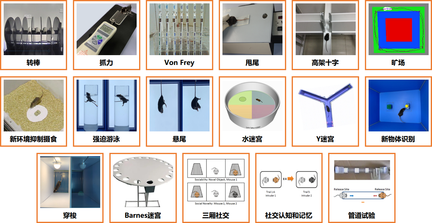 | 焦慮/抑郁情緒障礙 | 慢性不可預知溫和應(yīng)激所致抑郁小鼠模型,行為絕望抑郁模型 | ? 運動和感覺:曠場運動、轉(zhuǎn)棒、Von Frey機械痛、熱板、甩尾 ? 抑郁和焦慮:高架十字、O迷宮、強迫游泳、懸尾、糖水消耗 ? 認知記憶:Y迷宮、新物體識別、水迷宮 ? 社交:三箱社交、社交認知 |