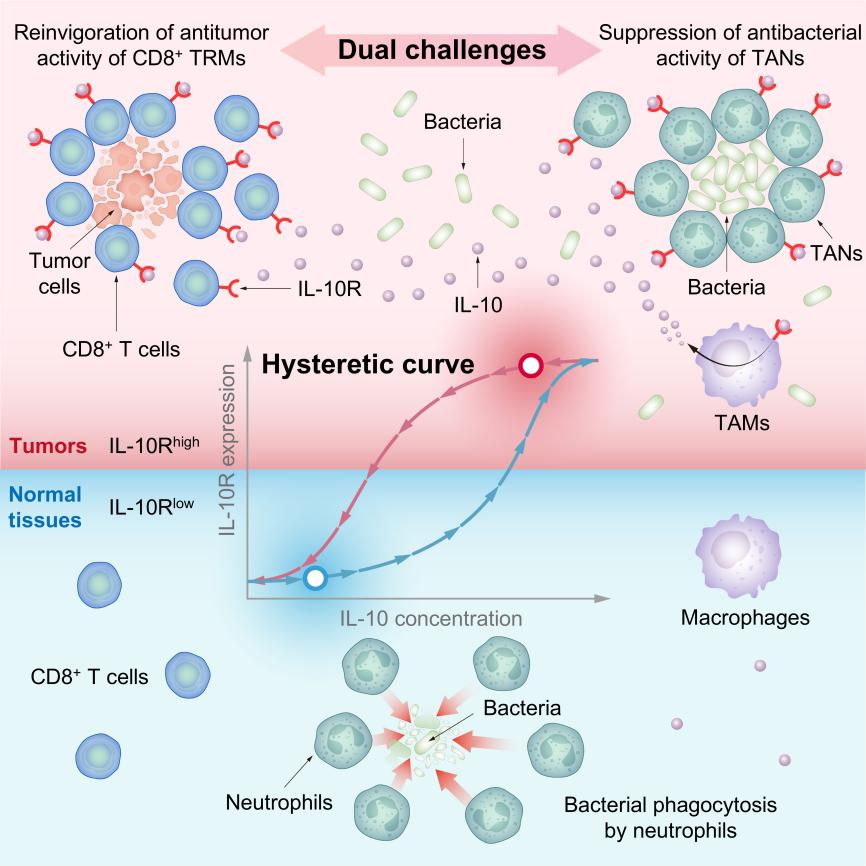 圖:IL-10R遲滯效應(yīng)導(dǎo)致了腫瘤微環(huán)境內(nèi)的免疫細(xì)胞IL-10R高表達(dá)特性,細(xì)菌利用這一特性,同時實(shí)現(xiàn)了其避免被中性粒細(xì)胞快速清除,并激活腫瘤內(nèi)組織駐留記憶CD8+?T細(xì)胞高效殺傷癌細(xì)胞。