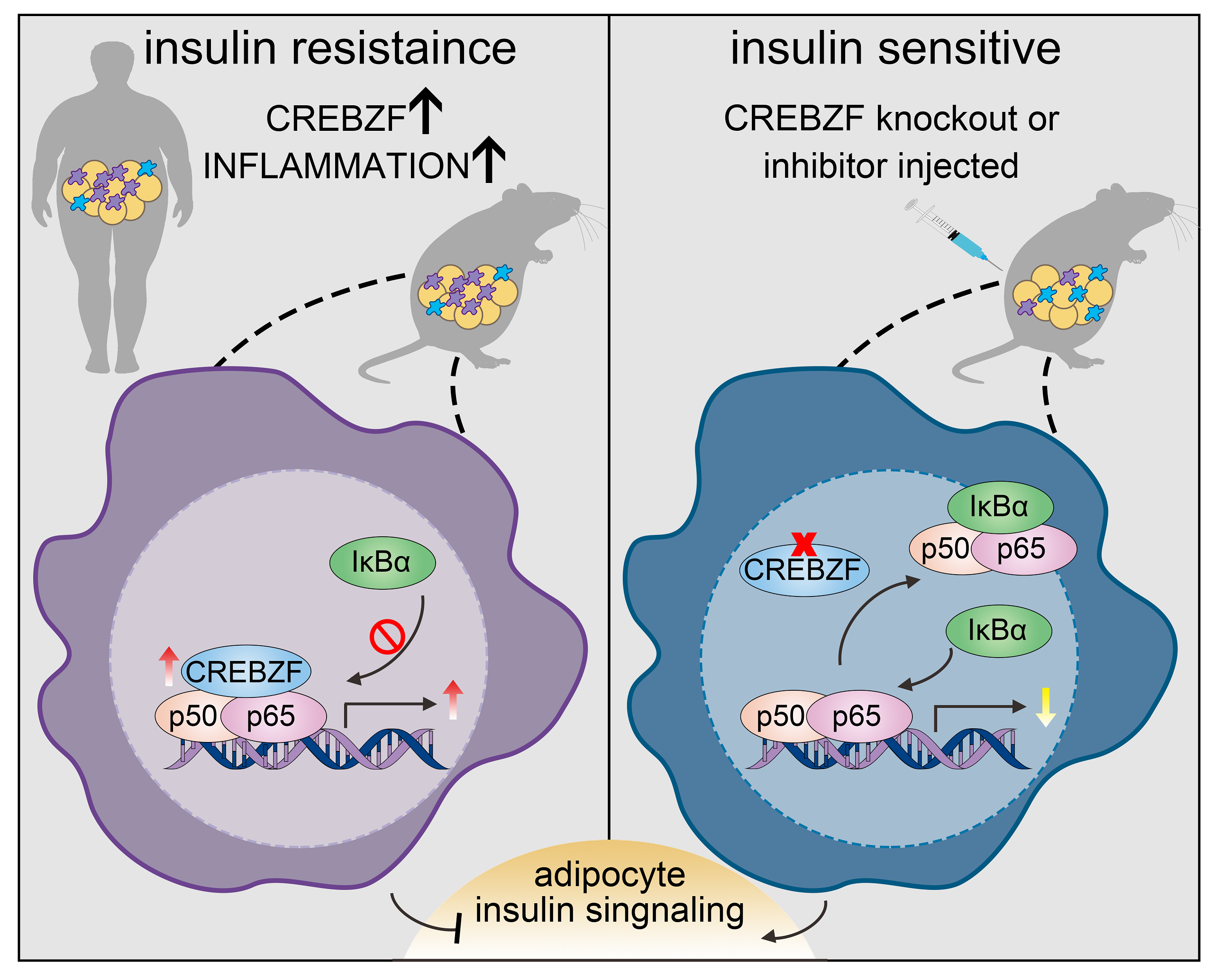 該研究揭示轉(zhuǎn)錄因子CREBZF通過調(diào)控NF-κB信號通路,進(jìn)而加重慢性炎癥和胰島素抵抗的分子機(jī)制。提示CREBZF可能是介導(dǎo)肥胖相關(guān)慢性炎癥、系統(tǒng)性胰島素抵抗和2型糖尿病的關(guān)鍵因子。同時,該研究為通過靶向抑制巨噬細(xì)胞CREBZF防治2型糖尿病提供新思路與潛在策略。