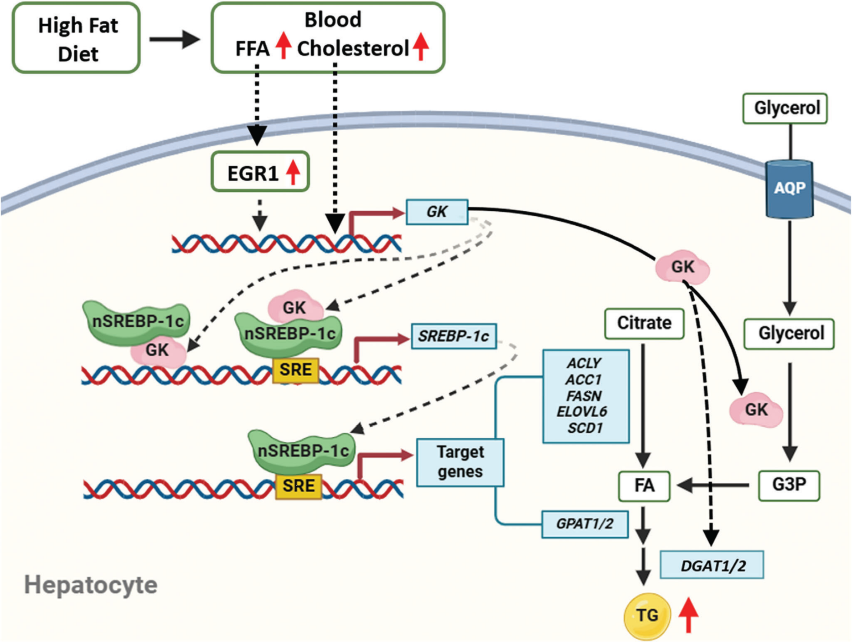 圖:高脂飲食誘導脂肪肝的過程GK促進肝細胞脂質累積的模式圖