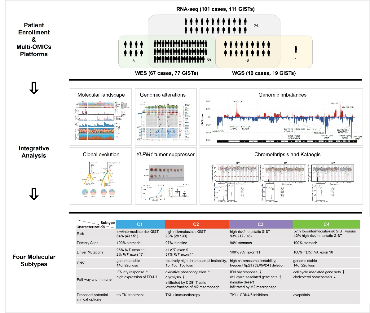 研究納入了通過DNA/RNA、病理和二代測序質(zhì)控的來自105位患者的117GIST,發(fā)現(xiàn)GIST腫瘤突變負(fù)荷低,但存在廣泛的拷貝數(shù)變異,并且隨著惡性程度增高,遺傳學(xué)變異增加。染色體碎裂(chromothripsis)和突變陣雨kataegis)等復(fù)雜遺傳學(xué)變異富集于原發(fā)高危和轉(zhuǎn)移GIST。研究進(jìn)一步鑒定出新型抑癌基因YLPM1,并證明YLPM1失活通過增強(qiáng)氧化磷酸化促進(jìn)GIST生長和進(jìn)展。利用來自同一病人不同轉(zhuǎn)移灶和原發(fā)/轉(zhuǎn)移配對腫瘤,證明轉(zhuǎn)移GIST具有復(fù)雜的遺傳學(xué)異質(zhì)性。最后,作者整合轉(zhuǎn)錄組、基因組和拷貝數(shù)組數(shù)據(jù)提出了新的分子分型,四種分子亞型具有不同的基因組、表達(dá)譜、免疫學(xué)以及臨床特性,提出并驗(yàn)證了亞型特異性治療策略,指出C1亞型單純手術(shù)切除病人即可長期獲益,C2亞型(小腸間質(zhì)瘤)而不是C3亞型(胃間質(zhì)瘤)有望獲益于免疫治療,C3亞型(免疫荒漠型)適合KIT抑制劑和CDK4/6抑制劑的聯(lián)合治療,C4亞型將獲益于PDGFRA的分子靶向治療。