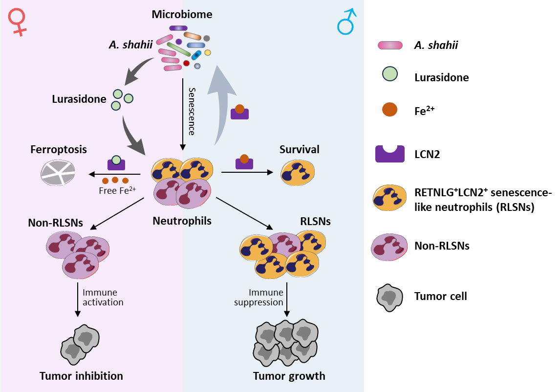 圖:中性粒細胞衰老調(diào)節(jié)腫瘤性別二態(tài)性模式圖