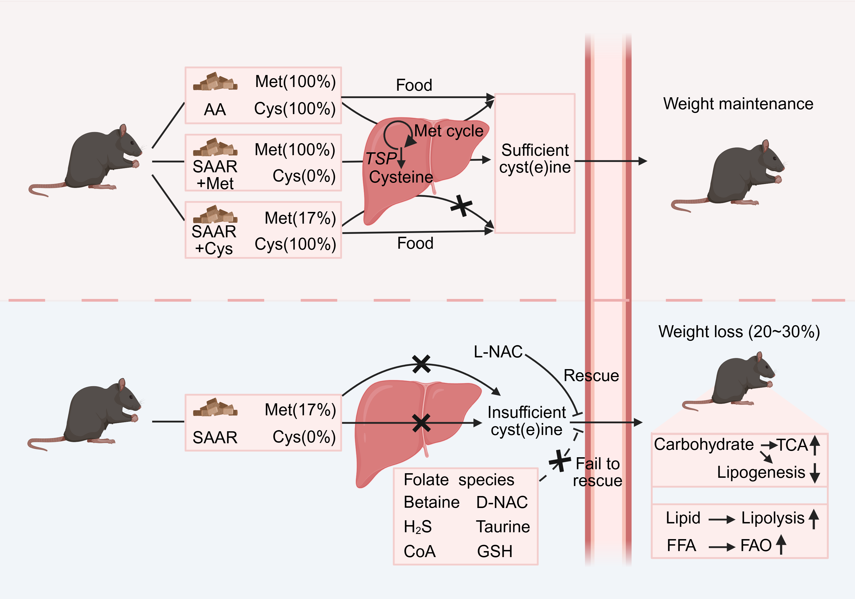 肥胖是誘發(fā)代謝綜合征的重要危險因素,目前的臨床干預手段如藥物治療、減重手術(shù)及生活方式管理可取得顯著成效,但其高昂費用、術(shù)后安全性、長期依賴及停藥后反彈等問題,也引發(fā)公眾相關(guān)困擾。近年來廣泛研究的飲食干預策略,如間歇性禁食(IF)、生酮飲食(KDs)及特定營養(yǎng)素限制,已被證實通過增強代謝信號,促進脂肪氧化等方式對體重控制有效。然而,長期禁食引發(fā)的情緒低落、認知障礙、毛囊干細胞死亡以及長期高脂肪攝入引發(fā)的血脂、胃腸道異常等問題都難以避免。在限制特定營養(yǎng)素攝入的方法中,飲食氨基酸限制已被證實是一種強有效的抗肥胖策略。限制支鏈氨基酸(BCAAs)的攝入量,可通過抑制mTORC1活性、促進線粒體呼吸,從而增加能量消耗。但因BCAAs在肌肉蛋白質(zhì)合成中的重要性,其攝入限制在不同人群中的安全性和適用性仍有待考量。SAAs也因其在慢病進展中的多方面作用,近年來備受關(guān)注。甲硫氨酸限制被發(fā)現(xiàn)在不同物種中均與壽命延長、胰島素敏感性增強及氧化應激減少相關(guān),(半)胱氨酸則在氧化還原穩(wěn)態(tài)及鐵死亡(ferroptosis)等領(lǐng)域,尤其是腫瘤學中被廣泛研究。然而,甲硫氨酸與(半)胱氨酸的單獨及聯(lián)合作用對減重的調(diào)控機制仍不清楚。