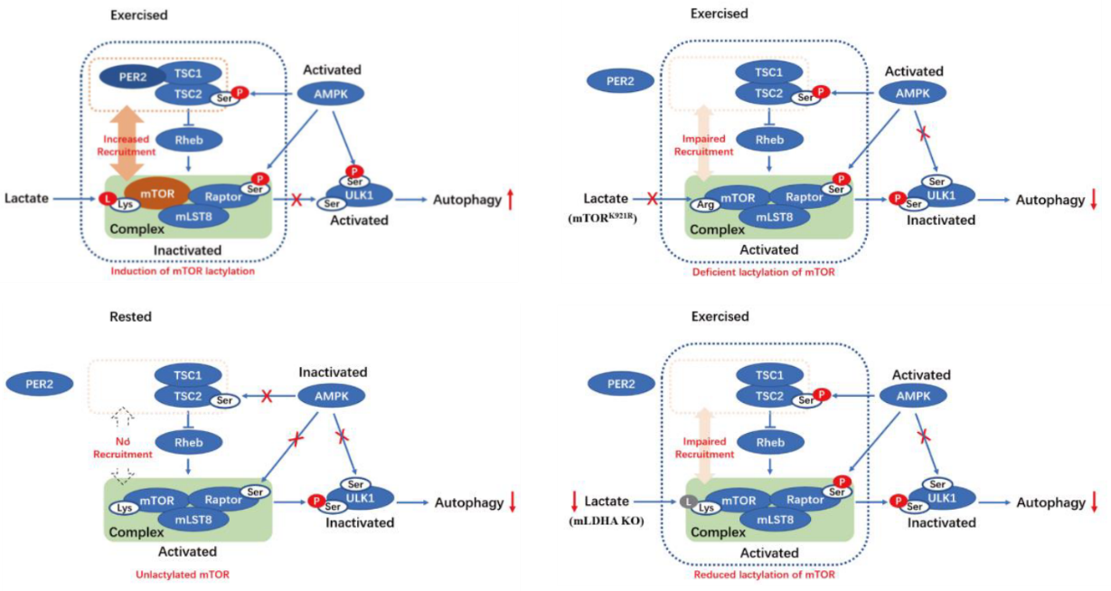通過該項研究,研究團隊提出以下工作假說(見下圖):運動導(dǎo)致骨骼肌乳酸迅速升高;升高的乳酸直接乳酸化修飾mTOR蛋白的K921位點;此修飾協(xié)同AMPK的激活,共同抑制mTORC1活性;mTORC1的抑制進而解除其對自噬啟動的剎車作用,最終激活自噬,清理受損細胞器,維持肌肉健康。