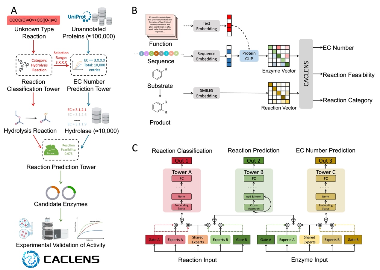 近年來,深度學習在酶的結構、功能與性質的大規(guī)模預測領域取得了顯著進展。然而,由于缺乏面向多模態(tài)輸入和多任務輸出的統(tǒng)一建模能力,現(xiàn)有方法仍難以滿足高性能功能酶篩選的需求。針對這一挑戰(zhàn),研究團隊設計并開發(fā)了CACLENS (Cross-Attention & Contrastive Learning-enabled Enzyme Selection)框架,將CGC(Customized Gate Control)門控機制、對比學習與交叉注意力等方法深度融合,構建出可同時執(zhí)行多項預測任務的一體化酶篩選平臺。