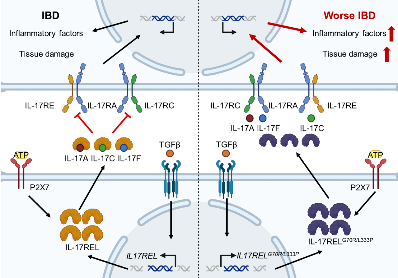 研究團隊長期從事IL-17家族細胞因子及其受體的研究,取得一系列研究成果(Nat. Immunol.?2011; Nat. Med.?2012; Immunity?2014, 2015, 2019)。本研究首次鑒定并系統(tǒng)闡明了IL-17家族的誘餌受體IL-17REL,解析了其表達調(diào)控機制及免疫功能,并明確其功能性突變是IBD的重要遺傳致病因素之一。這一發(fā)現(xiàn)不僅為深入理解IBD的發(fā)病機制提供了新的理論框架,也為開發(fā)靶向IL-17信號通路的創(chuàng)新治療策略提供了全新的潛在靶點。