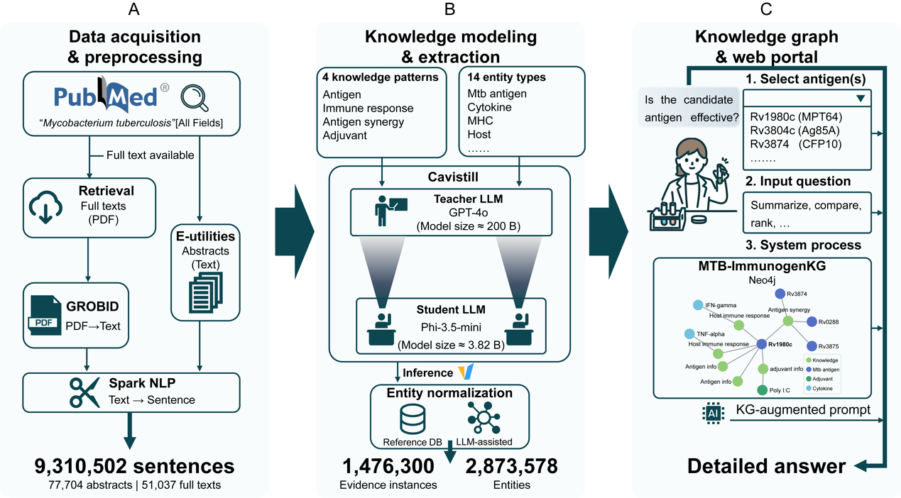 24,國(guó)際學(xué)術(shù)期刊Biosafety and Health在線發(fā)表了中國(guó)科學(xué)院上海營(yíng)養(yǎng)與健康研究所生物醫(yī)學(xué)大數(shù)據(jù)中心張國(guó)慶研究員團(tuán)隊(duì)與上海交通大學(xué)醫(yī)學(xué)院王穎教授團(tuán)隊(duì)的合作論文MTB-ImmunogenKG: An LLM-assisted knowledge graph for antigen selection in tuberculosis vaccine research”。研究團(tuán)隊(duì)開發(fā)了一種大模型輔助知識(shí)圖譜系統(tǒng)——MTB-ImmunogenKG,基于PubMed收錄的超過(guò)7.7萬(wàn)篇結(jié)核分枝桿菌相關(guān)文獻(xiàn),不僅能夠進(jìn)行基于知識(shí)增強(qiáng)的抗原保護(hù)效力預(yù)測(cè),還可系統(tǒng)構(gòu)建具有證據(jù)溯源能力與矛盾識(shí)別功能的抗原全景檔案,為新一代結(jié)核病疫苗的理性設(shè)計(jì)與抗原優(yōu)選提供透明可信的決策支持工具