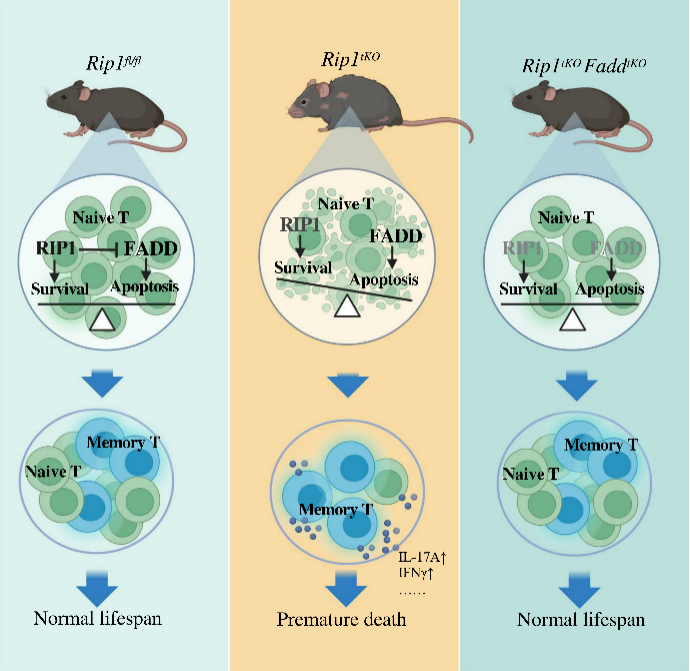 Receptor-Interacting Protein Kinase 1(RIP1/RIPK1)是決定細(xì)胞死亡與存活的關(guān)鍵調(diào)控蛋白,研究人員通過(guò)構(gòu)建T細(xì)胞特異性敲除RIP1基因的小鼠(Rip1tKO),發(fā)現(xiàn)Rip1tKO小鼠相對(duì)于同齡的野生型小鼠,呈現(xiàn)出系統(tǒng)性的早衰特征,包括過(guò)度的炎癥,弓背,毛發(fā)稀疏,身體機(jī)能下降,骨質(zhì)疏松、肌少癥等多種與年齡相關(guān)的表型,同時(shí)行為及認(rèn)知能力出現(xiàn)顯著下降,壽命也較野生型小鼠顯著縮短。機(jī)制研究發(fā)現(xiàn)RIP1的缺失導(dǎo)致T細(xì)胞的凋亡增加,并促進(jìn)T細(xì)胞向TH1和TH17亞型分化,誘導(dǎo)組織器官炎癥水平增高,進(jìn)一步促進(jìn)組織器官衰老標(biāo)志物表達(dá)升高。通過(guò)在Rip1tKO小鼠的基礎(chǔ)上進(jìn)一步構(gòu)建Fadd基因敲除的小鼠阻斷T細(xì)胞的凋亡,發(fā)現(xiàn)FaddtKORip1tKO雙基因敲除小鼠能夠恢復(fù)外周原始T細(xì)胞以及記憶T細(xì)胞穩(wěn)態(tài)平衡,并能逆轉(zhuǎn)Rip1tKo小鼠的胸腺萎縮以及全身系統(tǒng)性的早衰表型,同時(shí)延長(zhǎng)Rip1tKo小鼠的壽命至野生型小鼠水平,而阻斷T細(xì)胞的程序性壞死小鼠(Rip1tKoRip3-/-和Rip1tKoMlkl-/-)卻仍表現(xiàn)出與Rip1tKo小鼠相似的系統(tǒng)性衰老表型,提示Rip1tKO小鼠是T細(xì)胞過(guò)度凋亡導(dǎo)致外周原始T細(xì)胞的減少以及記憶T細(xì)胞的比例增加,促進(jìn)了組織的炎癥水平升高及組織細(xì)胞衰老,最終導(dǎo)致個(gè)體全身系統(tǒng)性的早衰發(fā)生。